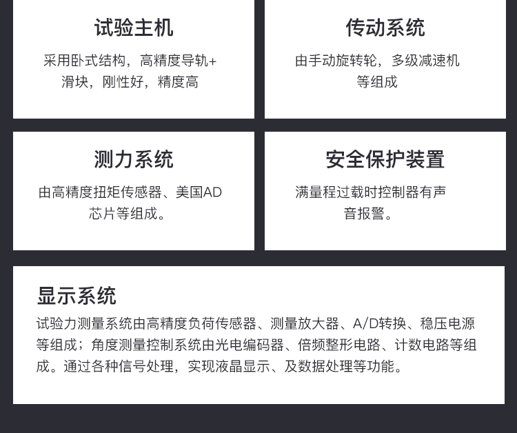 五、系統配置 1.主機一臺; 2.高精密導軌+滑塊二副; 3.減速系統一套 4.高精度負荷傳感器一只; 5.噴塑外殼一套 6.電源線、數據線各一根 7.地腳螺栓一套 8.試驗工具一套 9.扭轉附具一套 10.說明書、合格證、裝箱單各一份 11.全數字MCU控制系統一套;