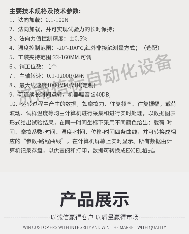 濟南信標自動化設備有限公司主要生產:動靜態萬能疲勞試驗機,接骨板彎曲試驗機,縫合線拉伸疲勞試驗機,髖膝關節磨損試驗機,電子萬能試驗機、液壓萬能試驗機、巖石三軸、四軸,電液拉力試驗機,材料試驗機,高低溫蠕變,高低頻疲勞,拉伸、扭轉、杯突等二十多個系列兩千多個的品種。