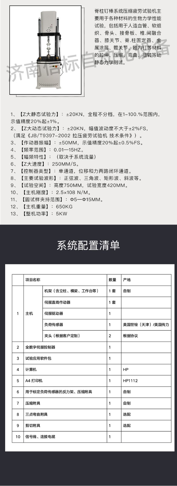 | 濟(jì)南信標(biāo)自動(dòng)化設(shè)備有限公司主要生產(chǎn):動(dòng)靜態(tài)萬(wàn)能疲勞試驗(yàn)機(jī),接骨板彎曲試驗(yàn)機(jī),縫合線拉伸疲勞試驗(yàn)機(jī),髖膝關(guān)節(jié)磨損試驗(yàn)機(jī),電子萬(wàn)能試驗(yàn)機(jī)、液壓萬(wàn)能試驗(yàn)機(jī)、巖石三軸、四軸,電液拉力試驗(yàn)機(jī),材料試驗(yàn)機(jī),高低溫蠕變,高低頻疲勞,拉伸、扭轉(zhuǎn)、杯突等二十多個(gè)系列兩千多個(gè)的品種。 |