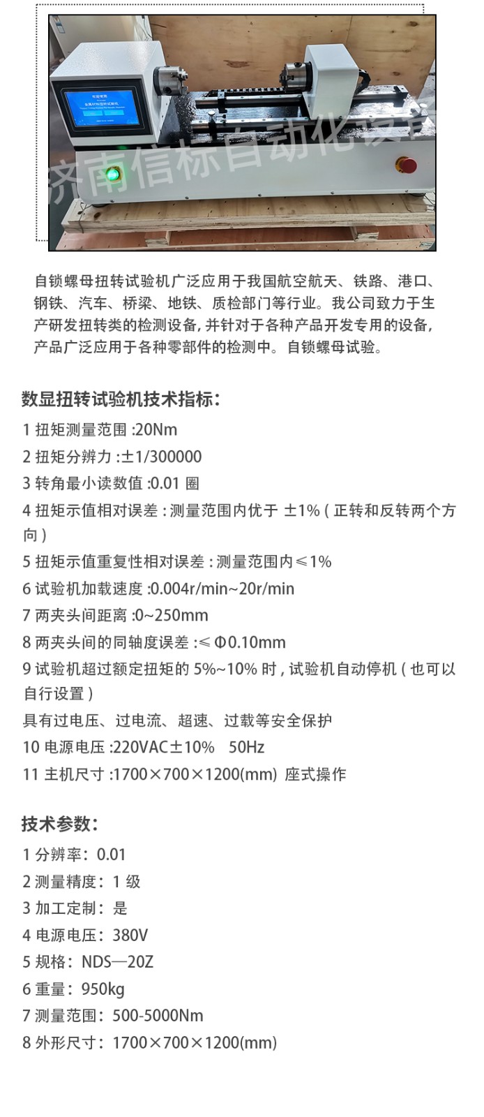 數(shù)顯扭轉(zhuǎn)試驗(yàn)機(jī)技術(shù)指標(biāo): 1 扭矩測量范圍:20Nm 2 扭矩分辨力:±1/300000 3 轉(zhuǎn)角最小讀數(shù)值:0.01圈 4 扭矩示值相對(duì)誤差:測量范圍內(nèi)優(yōu)于±1% (正轉(zhuǎn)和反轉(zhuǎn)兩個(gè)方向) 5 扭矩示值重復(fù)性相對(duì)誤差:測量范圍內(nèi)≤1% 6 試驗(yàn)機(jī)加載速度:0.004r/min~20r/min 7 兩夾頭間距離:0~250mm 8 兩夾頭間的同軸度誤差:≤Φ0.10mm 9 試驗(yàn)機(jī)超過額定扭矩的5%~10%時(shí),試驗(yàn)機(jī)自動(dòng)停機(jī)(也可以自行設(shè)置) 具有過電壓、過電流、超速、過載等安全保護(hù) 10 電源電壓:220VAC±10% 50Hz 11 主機(jī)尺寸:1700×700×1200(mm) 座式操作 功能特點(diǎn): 1、適用于WINDOWS平臺(tái)的中文試驗(yàn)軟件,實(shí)現(xiàn)試驗(yàn)數(shù)據(jù)采集處理。 2、可實(shí)時(shí)采集試驗(yàn)數(shù)據(jù)、運(yùn)算處理、實(shí)時(shí)顯示并打印結(jié)果報(bào)告。 3、曲線遍歷:可用鼠標(biāo)對(duì)曲線數(shù)據(jù)逐點(diǎn)訪問,以便求取各種數(shù)據(jù)。扭矩與扭角關(guān)系曲線中能反映任意點(diǎn)扭矩—角度的關(guān)系,能方便地在曲線上找到所求數(shù)據(jù)點(diǎn);可方便地對(duì)曲線局部放大還原等。 4、根據(jù)需要可隨時(shí)對(duì)扭矩、角度測量通道進(jìn)行手動(dòng)或自動(dòng)清零。 5、自動(dòng)存盤:試驗(yàn)條件、試驗(yàn)數(shù)據(jù)自動(dòng)存盤,需要時(shí)可隨時(shí)調(diào)出。 6、批量試驗(yàn):試驗(yàn)條件設(shè)定后,可依次完成一批樣品的試驗(yàn),試驗(yàn)條件、試樣參數(shù)、測試數(shù)據(jù)、結(jié)果可存儲(chǔ),隨時(shí)調(diào)用,再次試驗(yàn)無須設(shè)置。 7、打印試驗(yàn)報(bào)表。