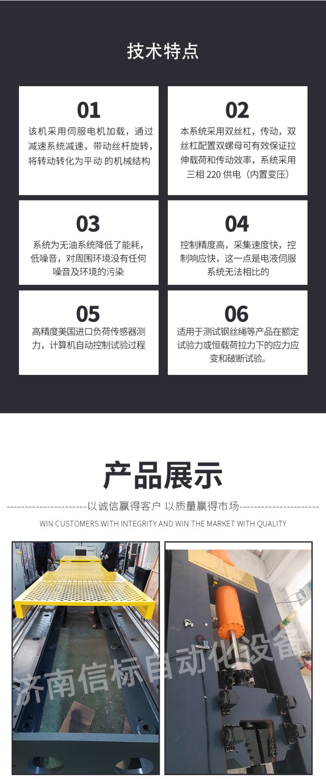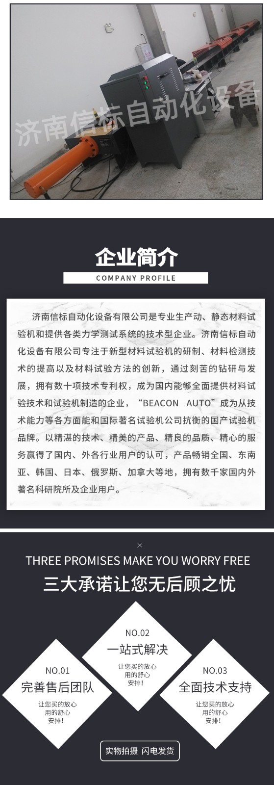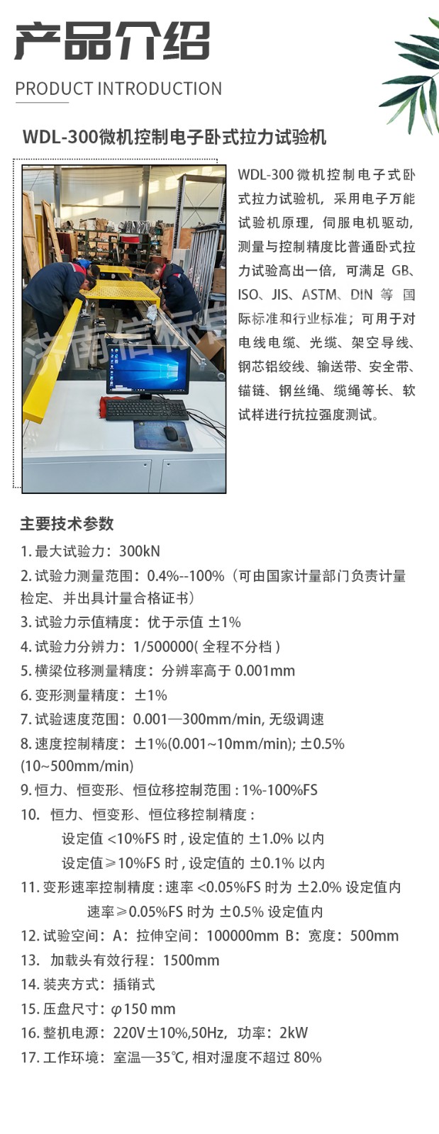 試驗(yàn)標(biāo)準(zhǔn): GB/T 8358-2014 鋼絲繩實(shí)際破斷拉力測(cè)定方法 GB∕T 1179-2008 圓線同心絞架空導(dǎo)線 DL/T 832-2003 光纖復(fù)合架空地線 DL/T 788-2001 全介質(zhì)自承式光纜 GB/T 7424.4-2003 光纜 第4部分:分規(guī)范 光纖復(fù)合架空地線 IEC 60794.4-2009 光纜 第4部分:分規(guī)范 輸電線架空光纜 IEEE 1138-2009 電力事業(yè)用電線的復(fù)合光纖架空地線的建造標(biāo)準(zhǔn) GB/T16491-2008 電子式萬(wàn)能試驗(yàn)機(jī) GB/T228.1-2010 金屬材料室溫拉伸試驗(yàn) GB/T4909.3-2009 裸電線試驗(yàn)方法 第3部分:拉力試驗(yàn) GB/T14049-2008 額定電壓10KV架空絕緣電纜 GB/T12527-2008 額定電壓1KV及以下架空絕緣電纜 GB/T3955-2009 電工圓鋁線 GB/T17048-2009 架空絞線用鋁線 GB/T17939-2009 電工用鋁包鋼線 GB/T3428/2012 架空絞線用鍍鋅鋼線 三、主要技術(shù)指標(biāo): 1. 最大試驗(yàn)力:300kN 2. 試驗(yàn)力測(cè)量范圍:0.4%--100% (可由國(guó)家計(jì)量部門負(fù)責(zé)計(jì)量檢定、并出具計(jì)量合格證書) 3. 試驗(yàn)力示值精度:優(yōu)于示值±1% 4. 試驗(yàn)力分辨力:1/500000(全程不分檔) 5. 橫梁位移測(cè)量精度:分辨率高于0.001mm 6. 變形測(cè)量精度:±1% 7. 試驗(yàn)速度范圍:0.001—300mm/min,無(wú)級(jí)調(diào)速 8. 速度控制精度:±1%(0.001~10mm/min); ±0.5%(10~500mm/min) 9. 恒力、恒變形、恒位移控制范圍: 1%-100%FS 10.恒力、恒變形、恒位移控制精度: 設(shè)定值<10%FS時(shí),設(shè)定值的±1.0%以內(nèi) 設(shè)定值≥10%FS時(shí),設(shè)定值的±0.1%以內(nèi) 11. 變形速率控制精度: 速率<0.05%FS時(shí)為±2.0%設(shè)定值內(nèi) 速率≥0.05%FS時(shí)為±0.5%設(shè)定值內(nèi) 12. 試驗(yàn)空間: A:拉伸空間:100000mm B:寬度:500mm 13.加載頭有效行程:1500mm 14. 裝夾方式:插銷式 15. 壓盤尺寸:φ150 mm 16. 整機(jī)電源:220V±10%,50Hz,功率:2kW 17. 工作環(huán)境:室溫—35℃,相對(duì)濕度不超過(guò)80%